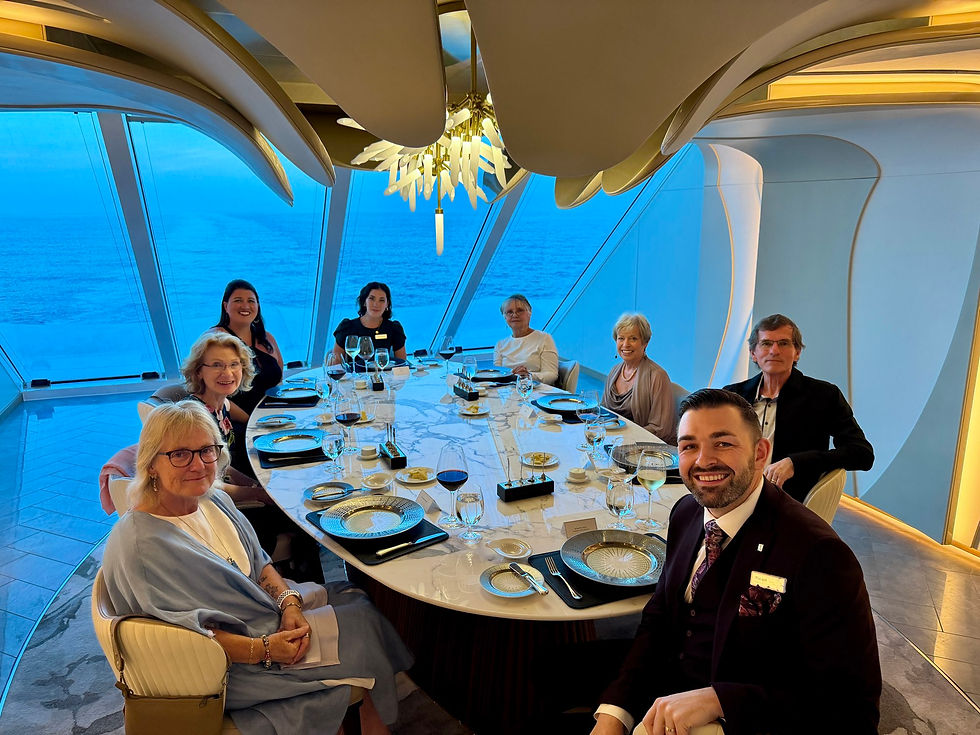 This evening as a bit more action packed than normal given that I went to both evening entertainment events (Our World show with the Production Cast and Sonia Selbie’s show) which sandwiched a private dining experience a the Privée room with Casey and Robbie. The Privée experience provides a unique in that we were given the menus from both Polo Grill and Tuscana, so we could order from either or both restaurants, and we were welcomed into the stunning dining room located on the back of the the ship. The guests were a mixture of others who are going around the World, as you may imagine, whom I had all met before.